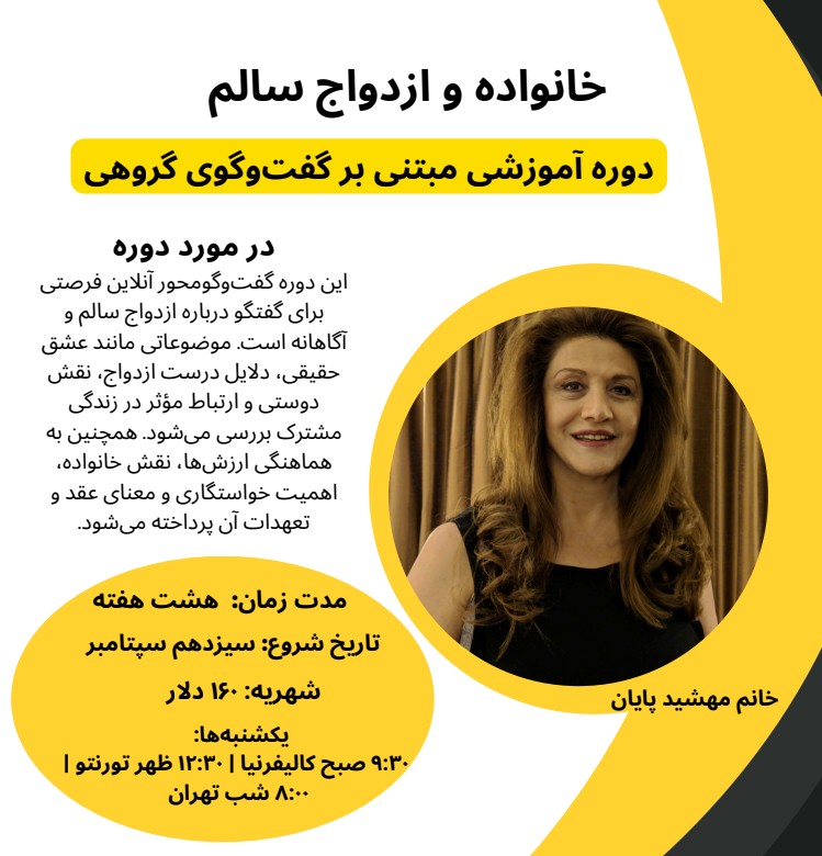 این دوره گفتوگومحور آنلاین فرصتی برای گفتگو درباره ازدواج سالم و آگاهانه است. موضوعاتی مانند عشق حقیقی، دلایل درست ازدواج، نقش دوستی و ارتباط مؤثر در زندگی مشترک بررسی میشود. همچنین به هماهنگی ارزشها، نقش خانواده، اهمیت خواستگاری و معنای عقد و تعهدات آن پرداخته میشود